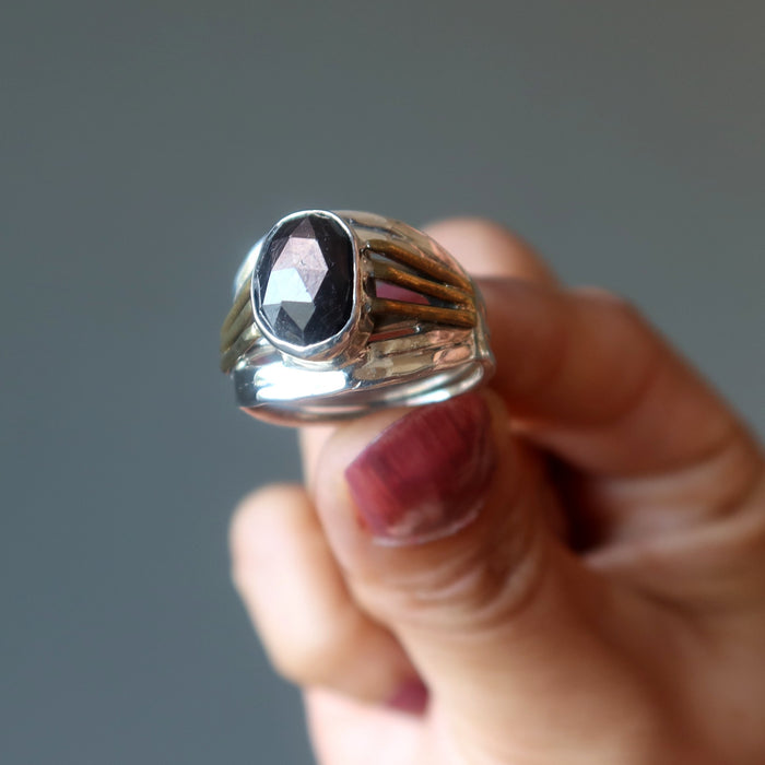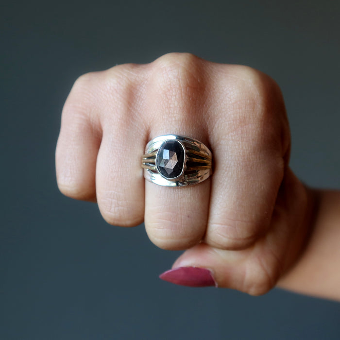 This precious Sapphire ring is sparkling black and full of bling. A dark and faceted jewel makes a grandeur appearance on the sterling silver band. You feel powerful, prosperous, and protected wearing the gemstone ring.