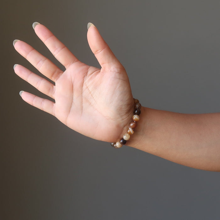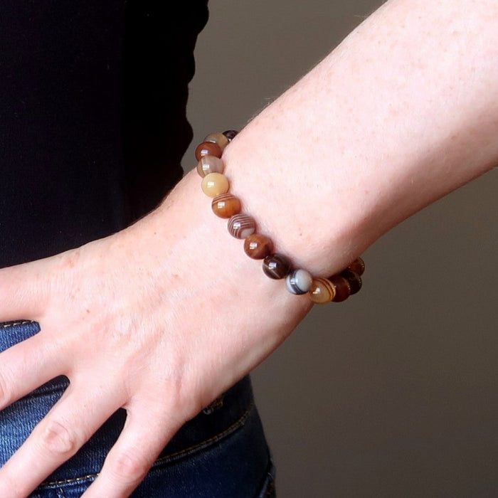 Your bracelet showcases natural and dyed Sardonyx on a sturdy elastic stretch cord. The polished roundish beads vary in bands, patterns, and colors including white, clear, brown, black, or yellow. Each stone differs. Beaded in the Satin Crystals studio in the USA.