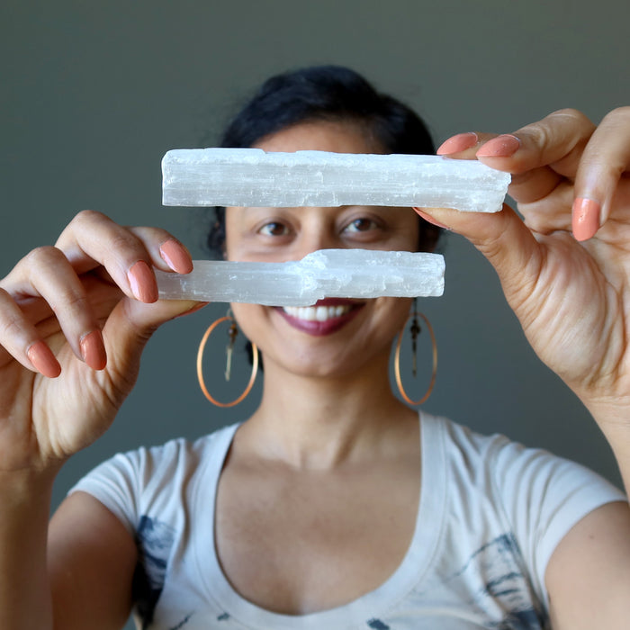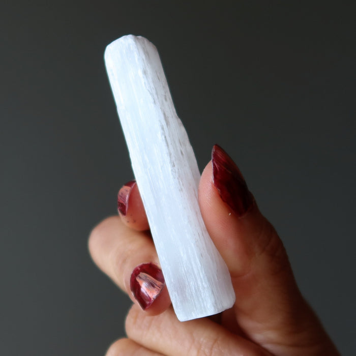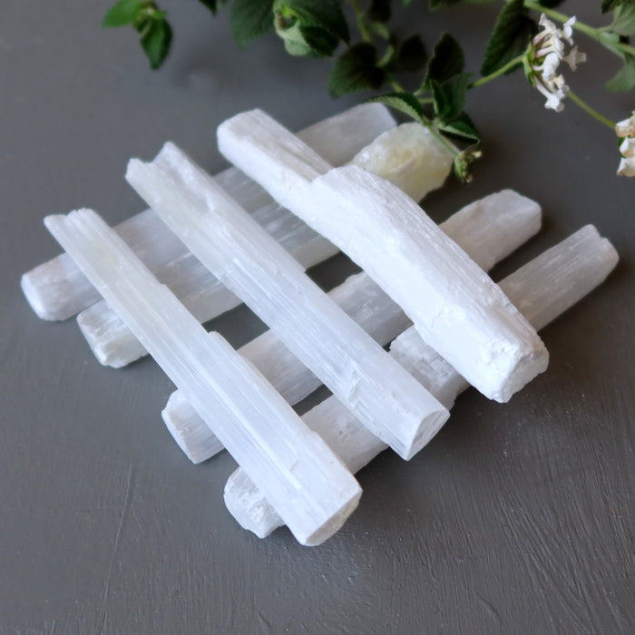 Your stone showcases natural and untreated Satin Spar Selenite from Morocco. This is a fibrous white stone that may show mineral inclusions. Each raw stick is unique.