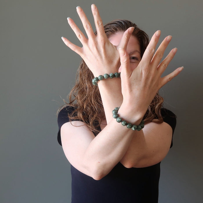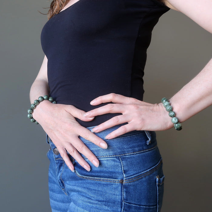 Your bracelet showcases natural and untreated Seraphinite gemstones. Seraphinite is a feathery, rich green stone flashing with blades of sheen. It is polished into deluxe round beads and strung on a sturdy elastic stretch cord. Each stone differs. Beaded in the Satin Crystals studio in the USA.