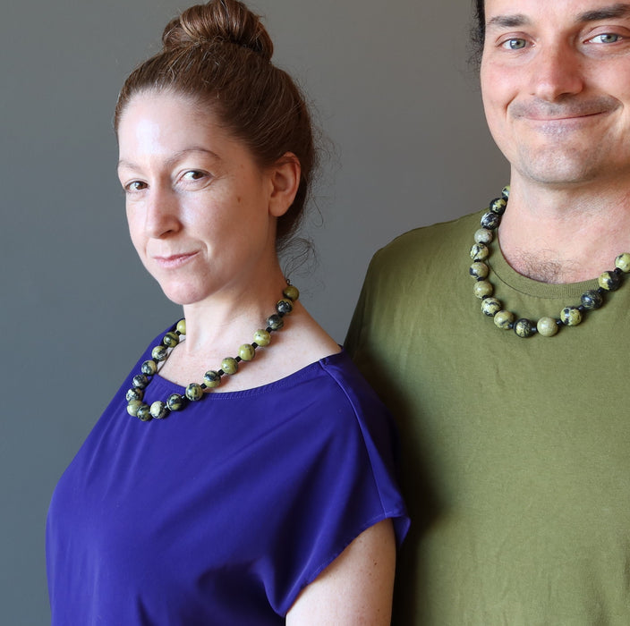 Your necklace features natural and untreated Serpentine. These are yellowish-green stones with random black-and-white inclusions. The natural gemstones are polished into smooth, round-ish beads and are beaded with black or brown wood on the professional necklace wire. The chunky necklace is secured with a large lobster claw clasp. Beaded at Satin Crystals in the USA.