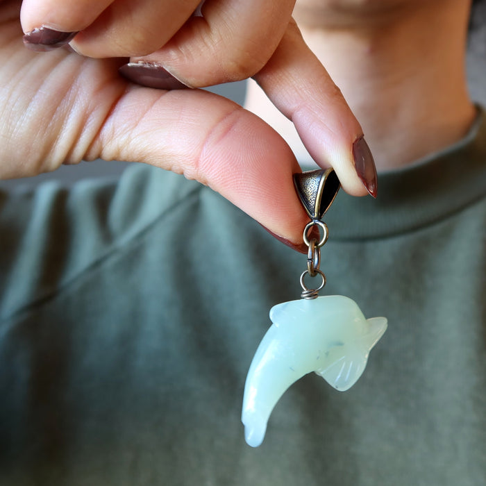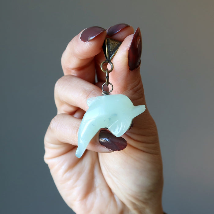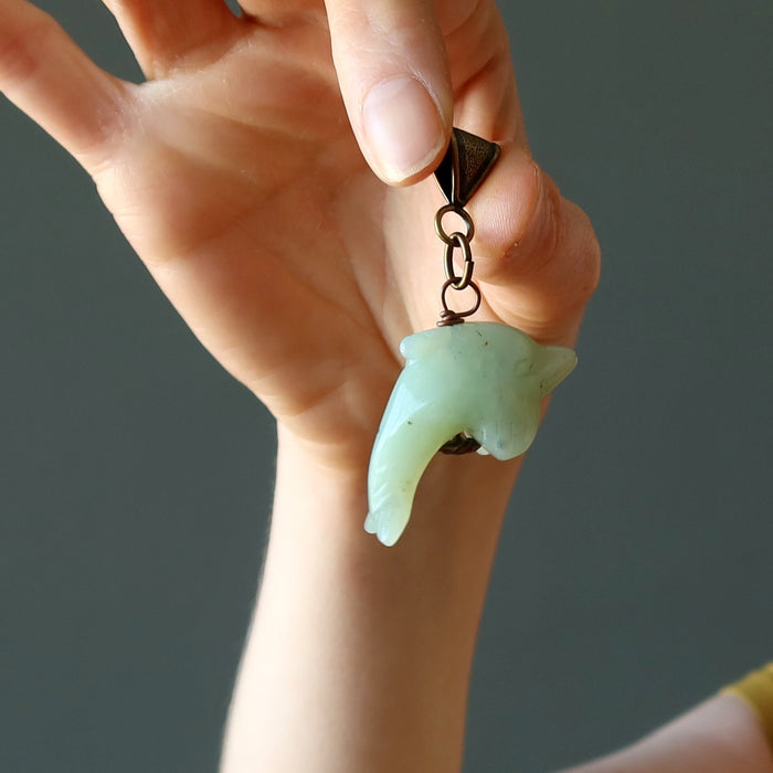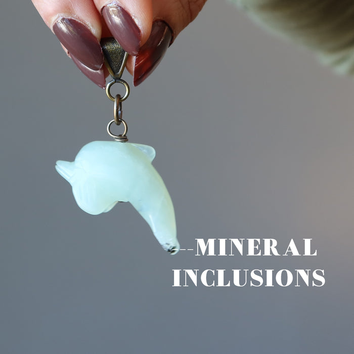 Your new pendant features natural, untreated Serpentine. This is a glossy pale green stone with mineral inclusions, carved into a dolphin and hung from antiqued brass metals. Each stone is unique. Add a necklace chain.
