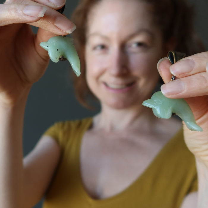 Catch the playful spirit of the jumping dolphin with your new Serpentine Quartz pendant. Thing dolphin is a symbol of adventure, wisdom, and soulfulness. Your little green pal passes these positive traits on to you.