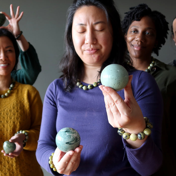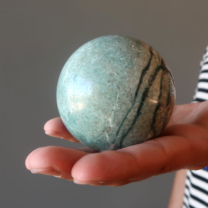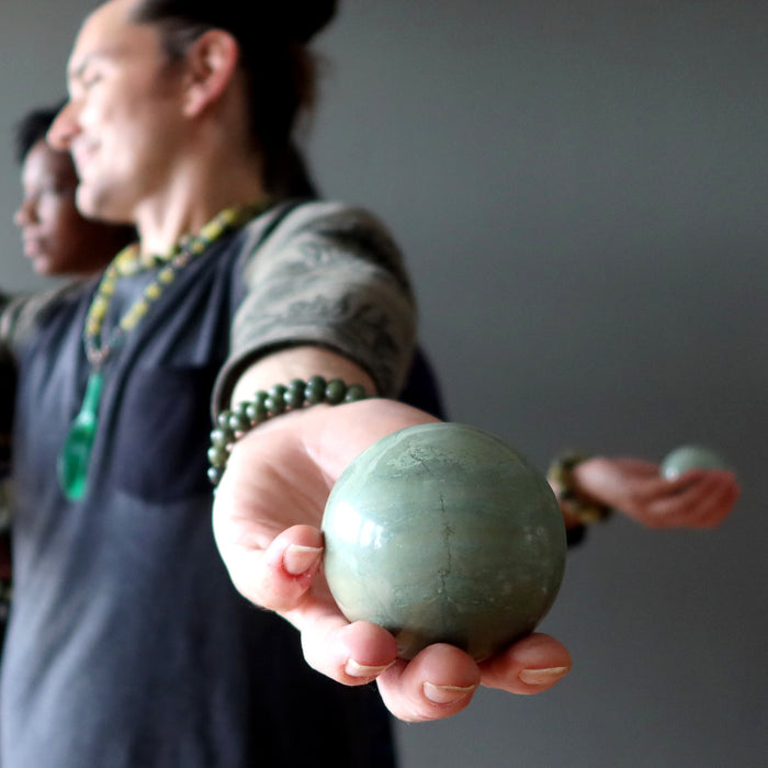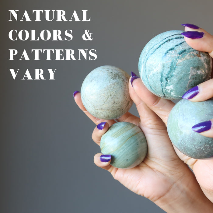 This Green Potion Serpentine sphere feels alive in your hands. Mythical monsters become awakened in the unpredictable splashes of minerals and waves. Your sphere infuses magic into your life and sparkles into your soul while bedazzling everyone around you.