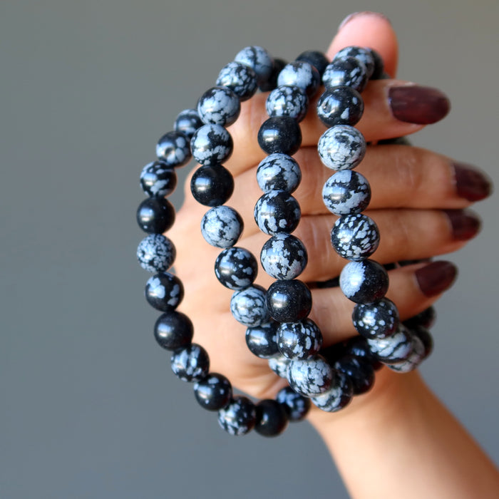 Your bracelet showcases natural and untreated Snowflake Obsidian beads. This is a black stone with natural gray snow-like inclusions. It is polished into smooth, round beads and strung on sturdy elastic stretch cords. Each stone differs. Beaded in the Satin Crystals studio in the USA.