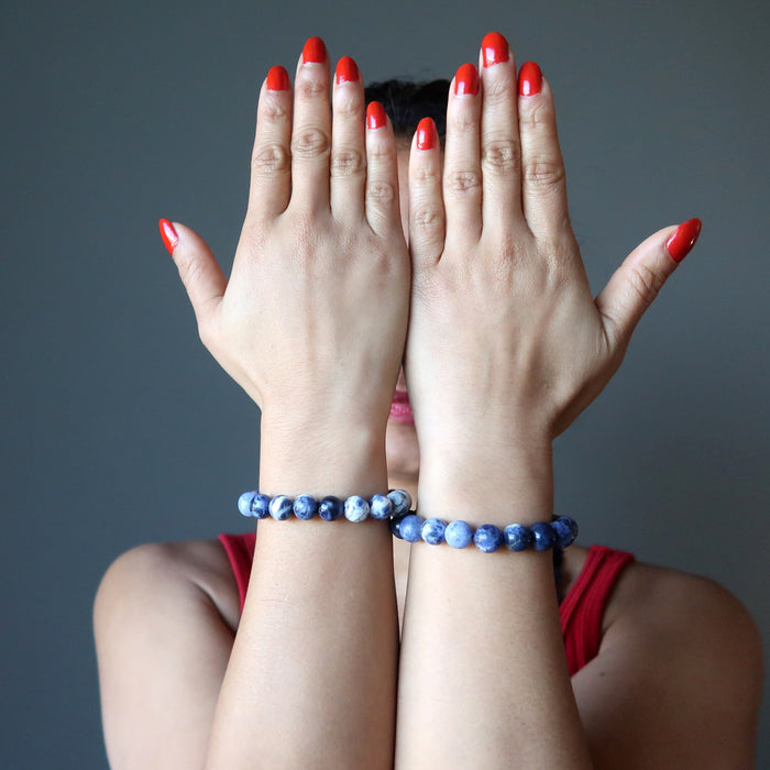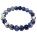 Your bracelet showcases natural and untreated Sodalite on a sturdy elastic stretch cord. The mottled blue and white stones are polished into roundish beads. Each stone differs. Beaded in the Satin Crystals studio in the USA.