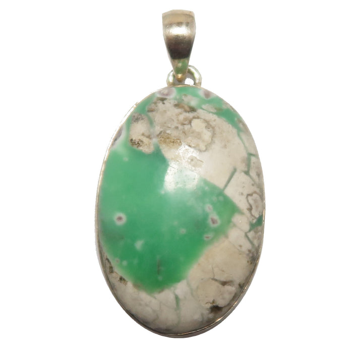 Your new pendant features natural and untreated Variscite. This is a green stone with white patches polished into an oval and set in sterling silver. Each stone is unique. Add a necklace chain.