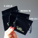 These drawstring pouches are created from black suede with gold print. Measurements are total size, not inside measurements.