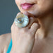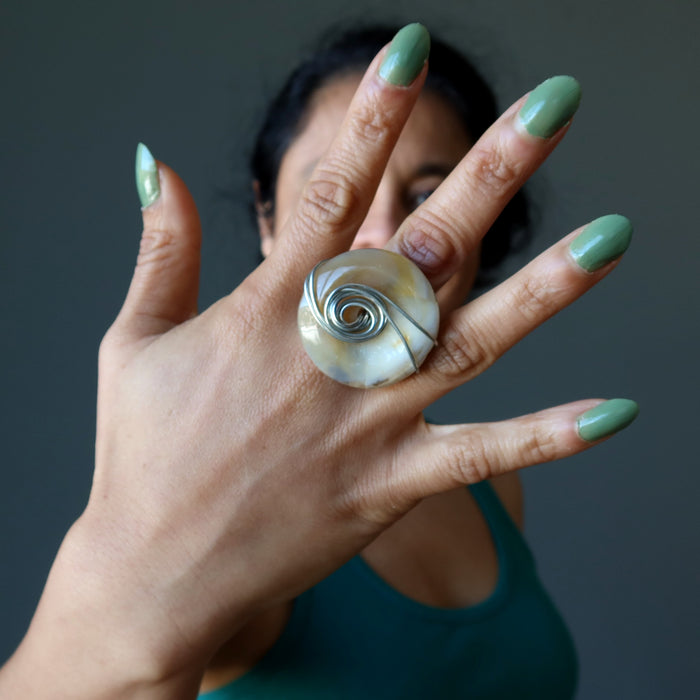 Your ring features natural and untreated Agate. This is a natural translucent yellow and creamy white Agate stone polished into a big donut. The Agate donut is wrapped in silver-plated copper wire. This one-of-a-kind ring was wrapped in the Satin Crystals studio in the USA.