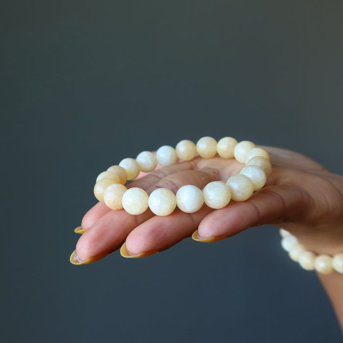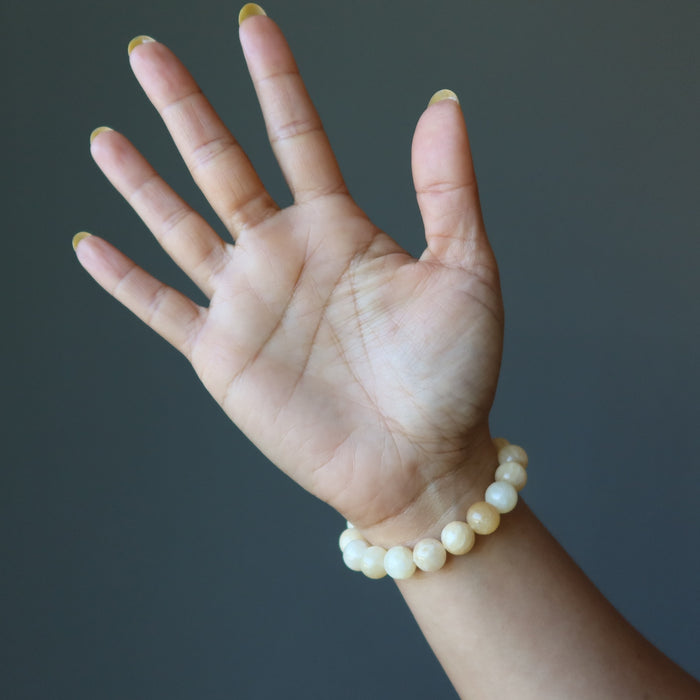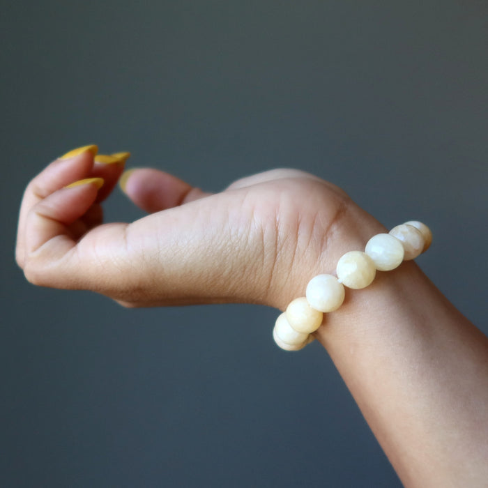 Your bracelet showcases natural and untreated Yellow Calcite on a sturdy elastic stretch cord. The stone is polished into roundish beads. Each stone differs. Beaded in the Satin Crystals studio in the USA.