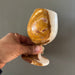 Your one-of-a-kind goblet is carved from banded yellow Calcite with brown Aragonite, also known as Italian Onyx. The stem has been repaired but can be used as intended.